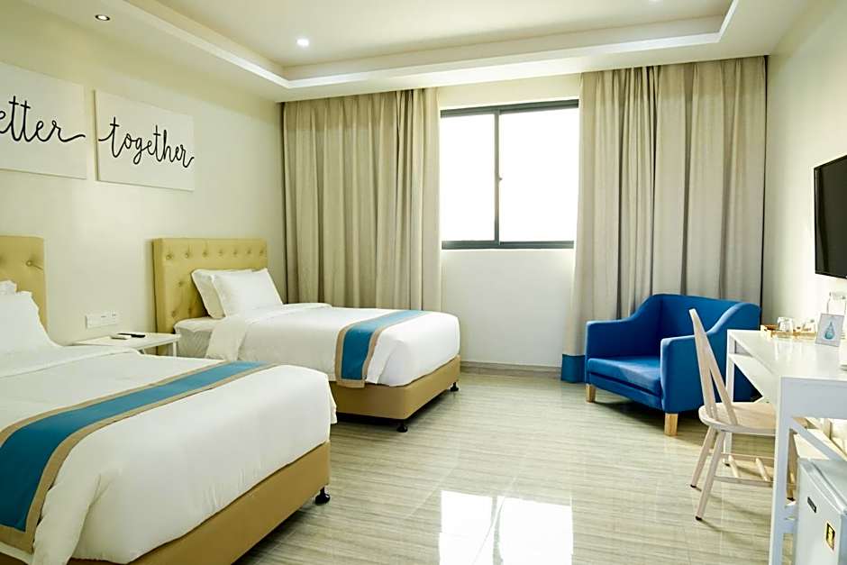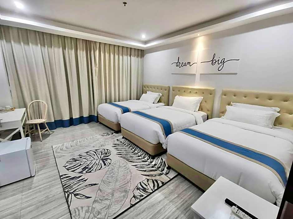 The family room features air conditioning, a seating area, a tiled floor, a flat-screen TV, as well as city views. The unit has 2 beds.